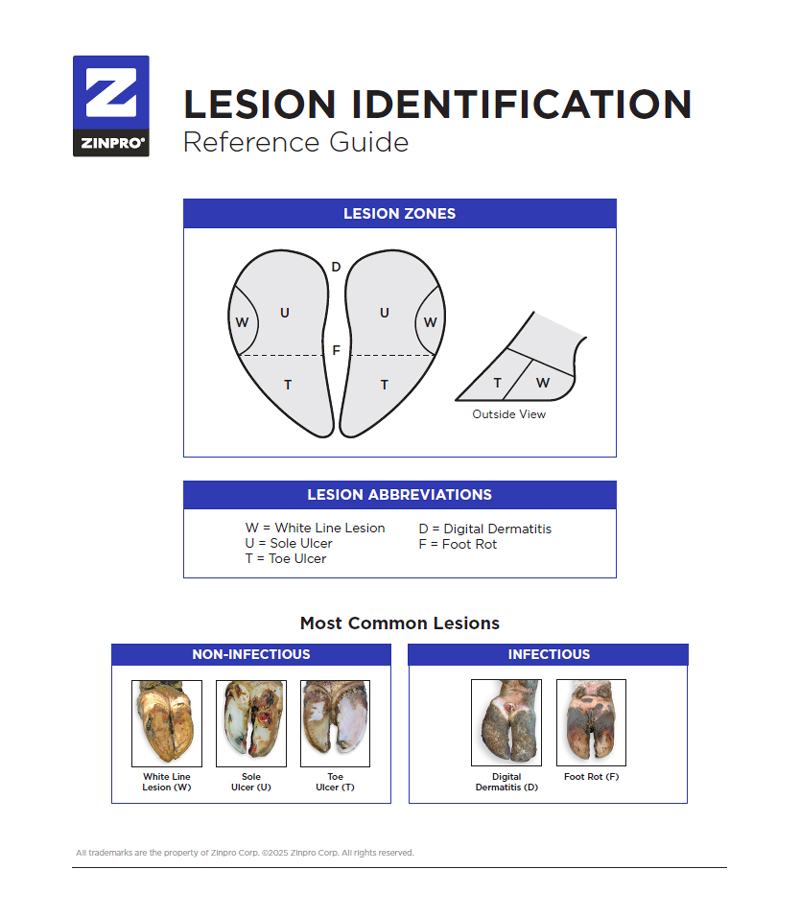 Accurate trimming and lameness incidence records help us get a clearer picture of what is happening on the dairy. A standard method for recording lameness helps us dig into the data and the underlying causes of the issue. For example, “abscess” or “block” on the trim sheet does not give us much information on what type of issue the trimmer encountered with that animal. Zinpro has created a Lesion Identification Guide that helps properly identify lesions (see image below). When clear identification is used, we can all speak the same language.